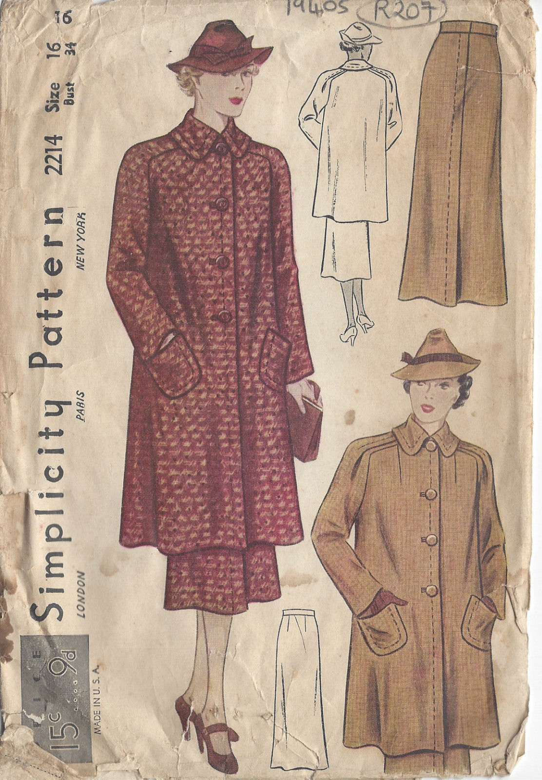 1930s Vintage Sewing Pattern COAT & SKIRT B34″ (R207)