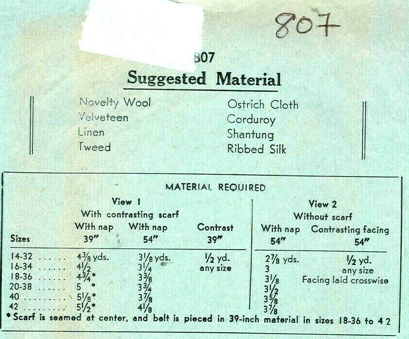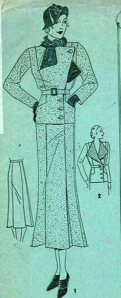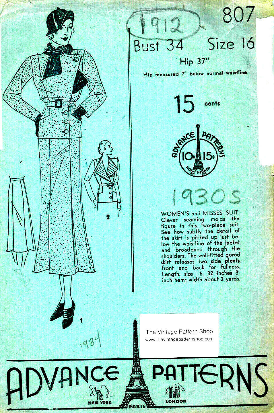 1934 Vintage Sewing Pattern B34″ TWO-PIECE SUIT (Jacket & Skirt) (1912) By Advance 807