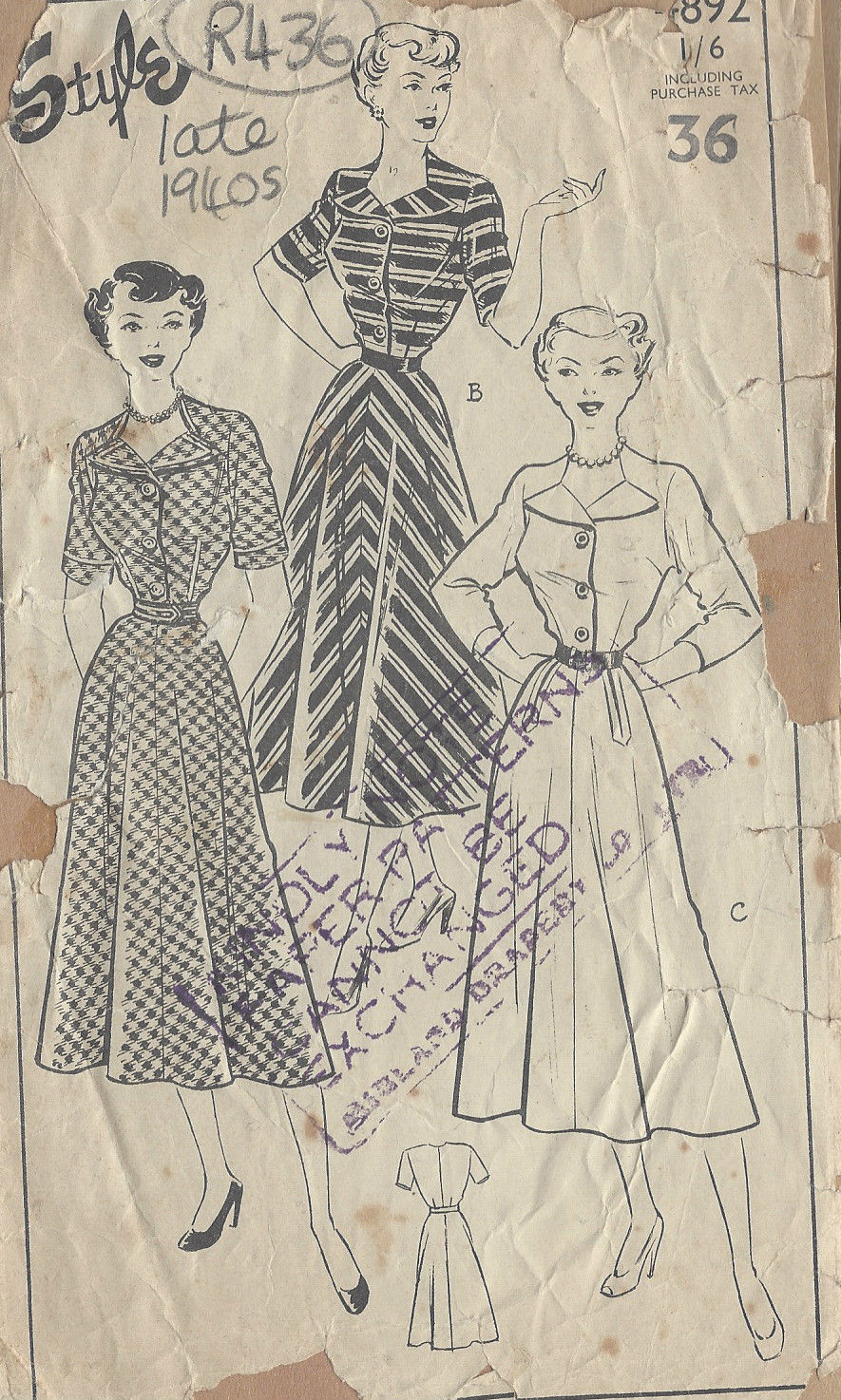 1940s Vintage Sewing Pattern B36″ DRESS (R436)