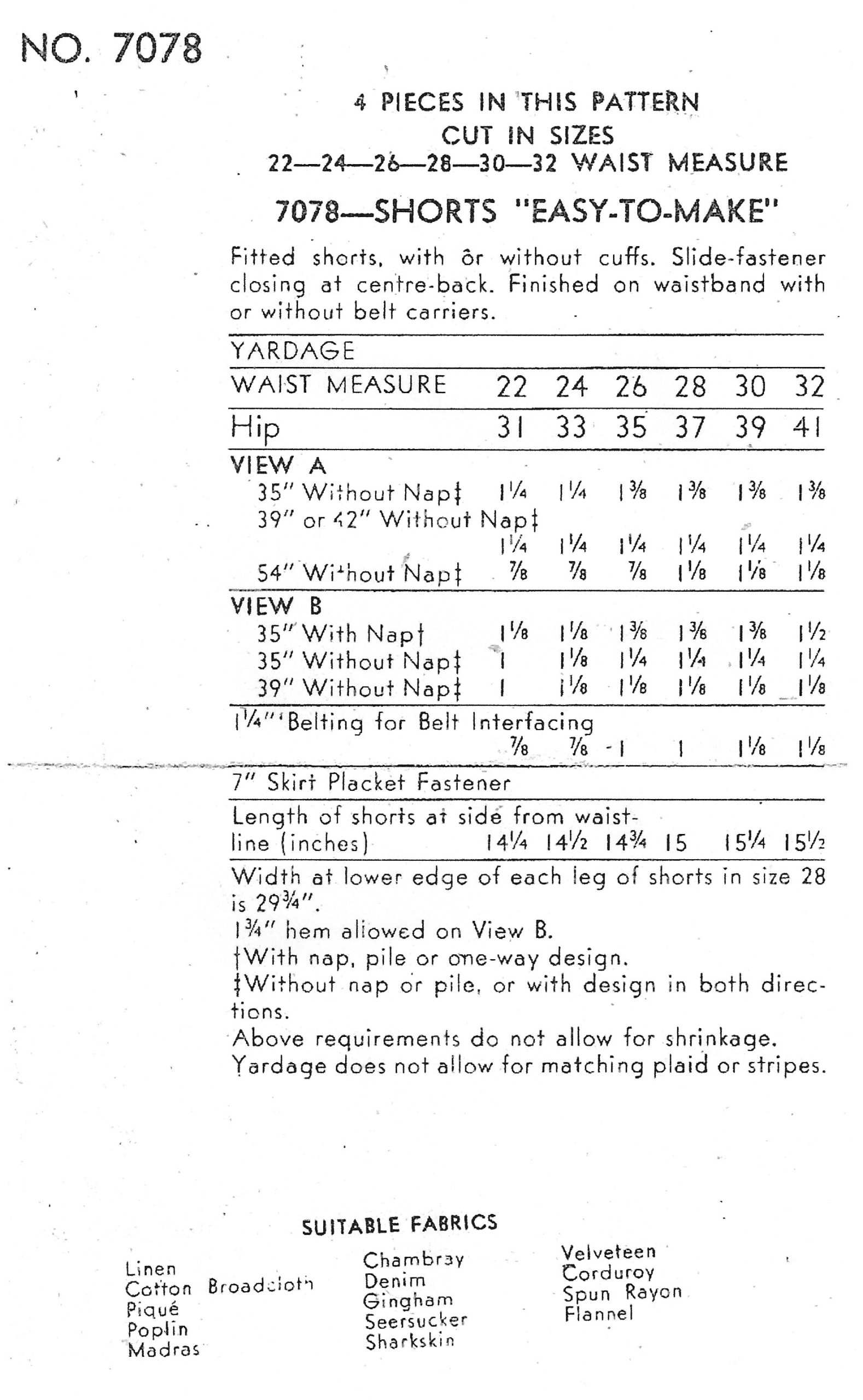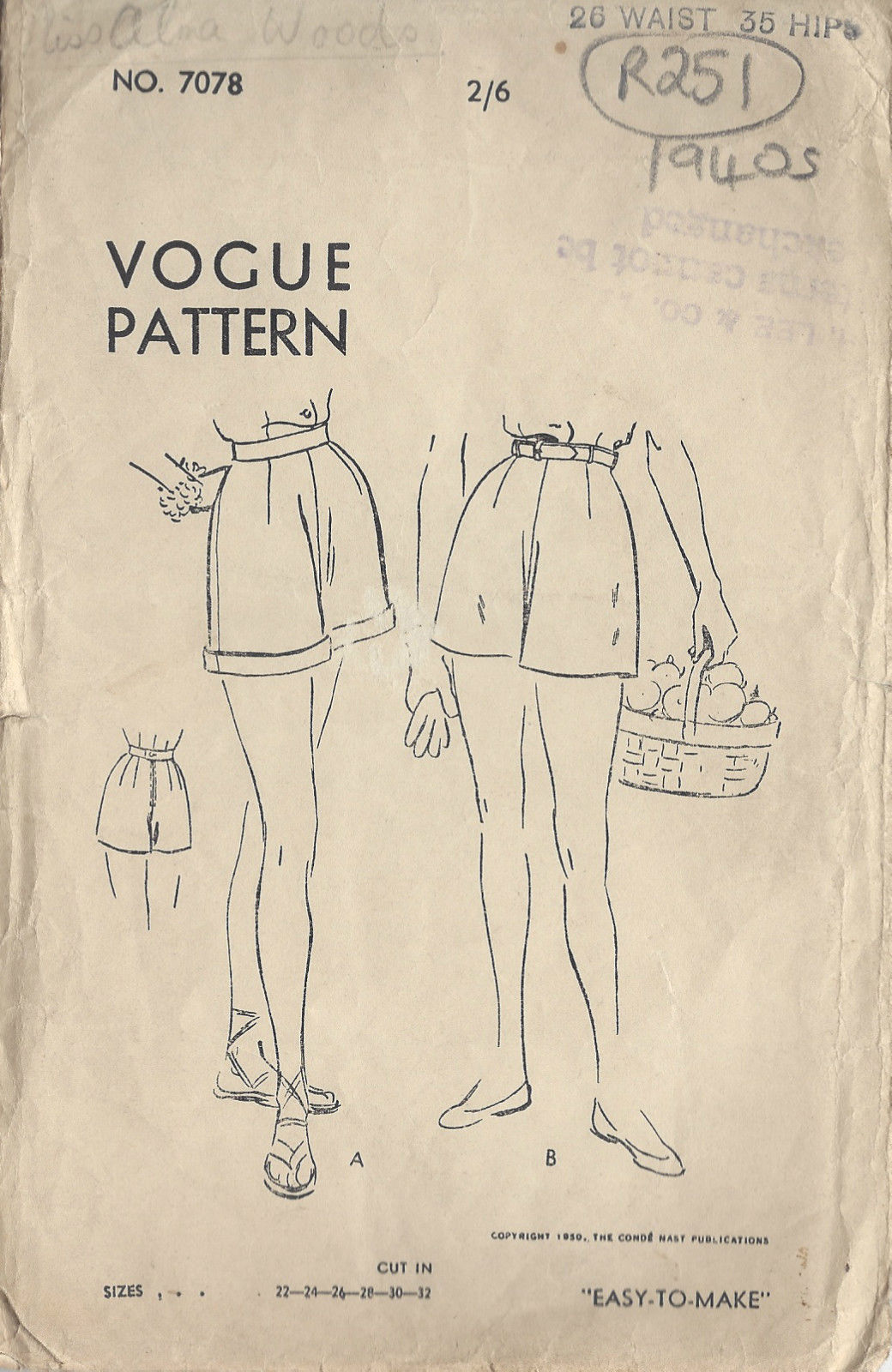 1940s Vintage VOGUE Sewing Pattern W26″ SHORTS (R251) By Vogue 7078