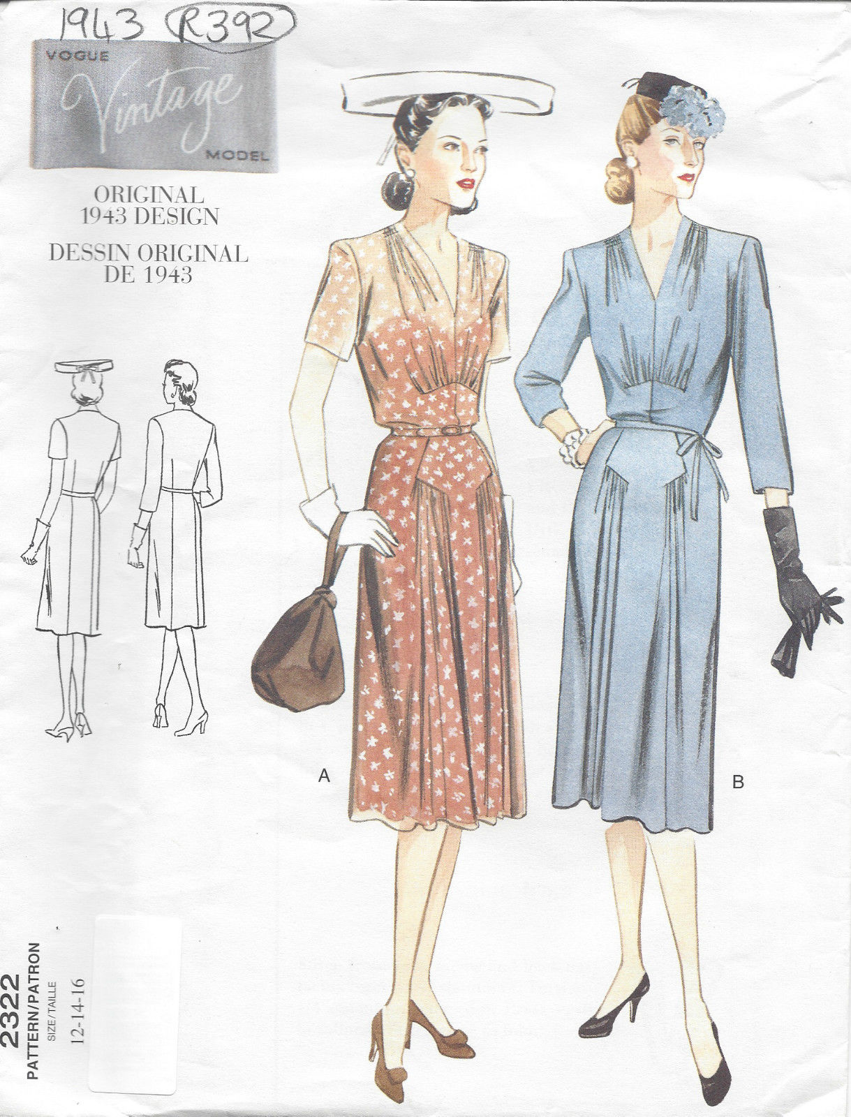 1943 Vintage VOGUE Sewing Pattern DRESS B34″-36″-38″ (R392) Vogue 2333