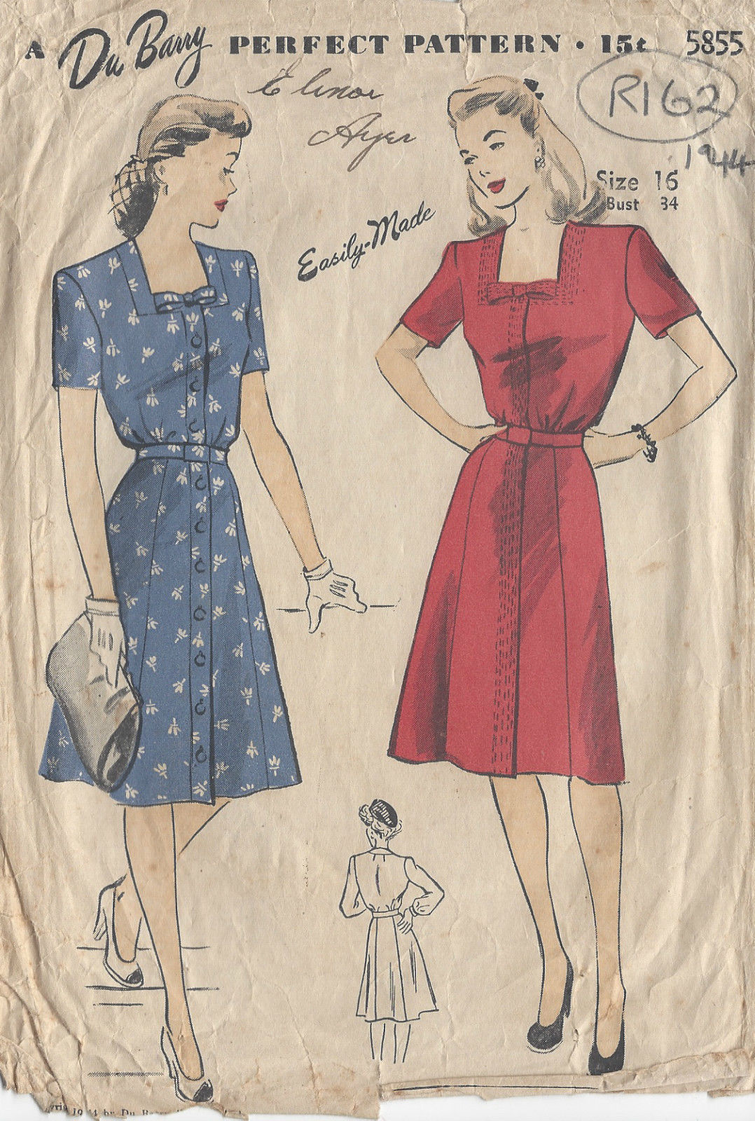 1944 Vintage Sewing Pattern DRESS B34″ (R162) By ‘Du Barry’