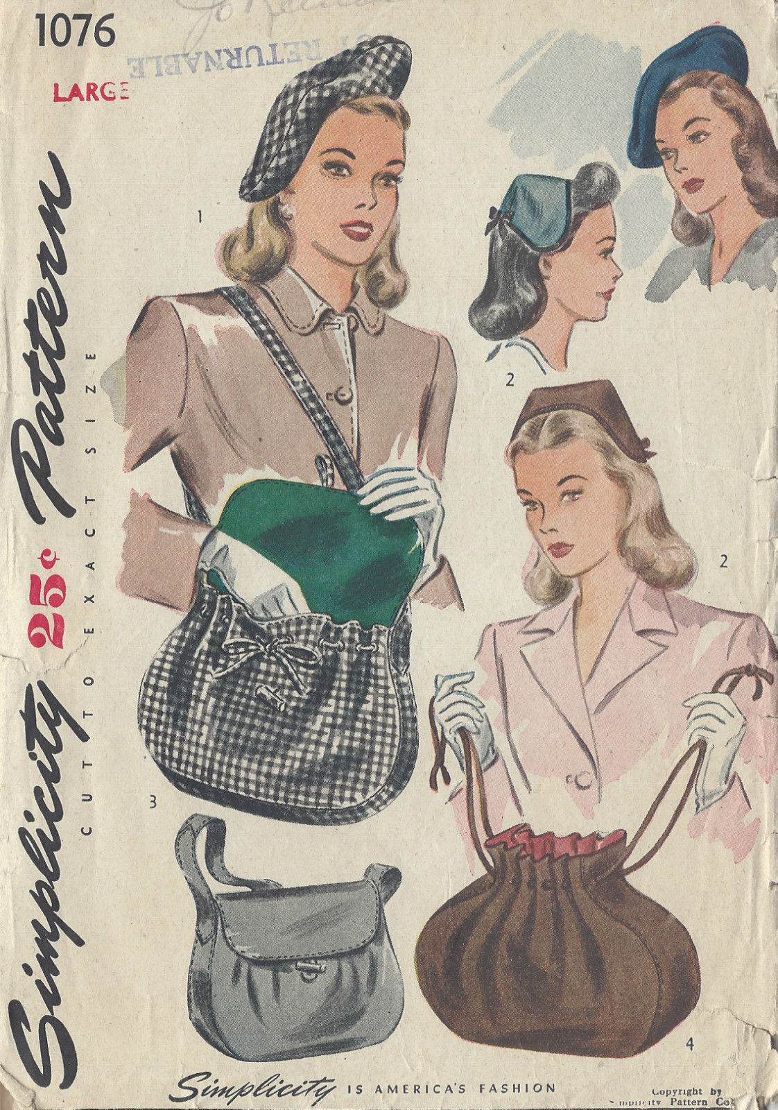 1944 Vintage Sewing Pattern S23″ HAT, BERET & BAGS (R838)
