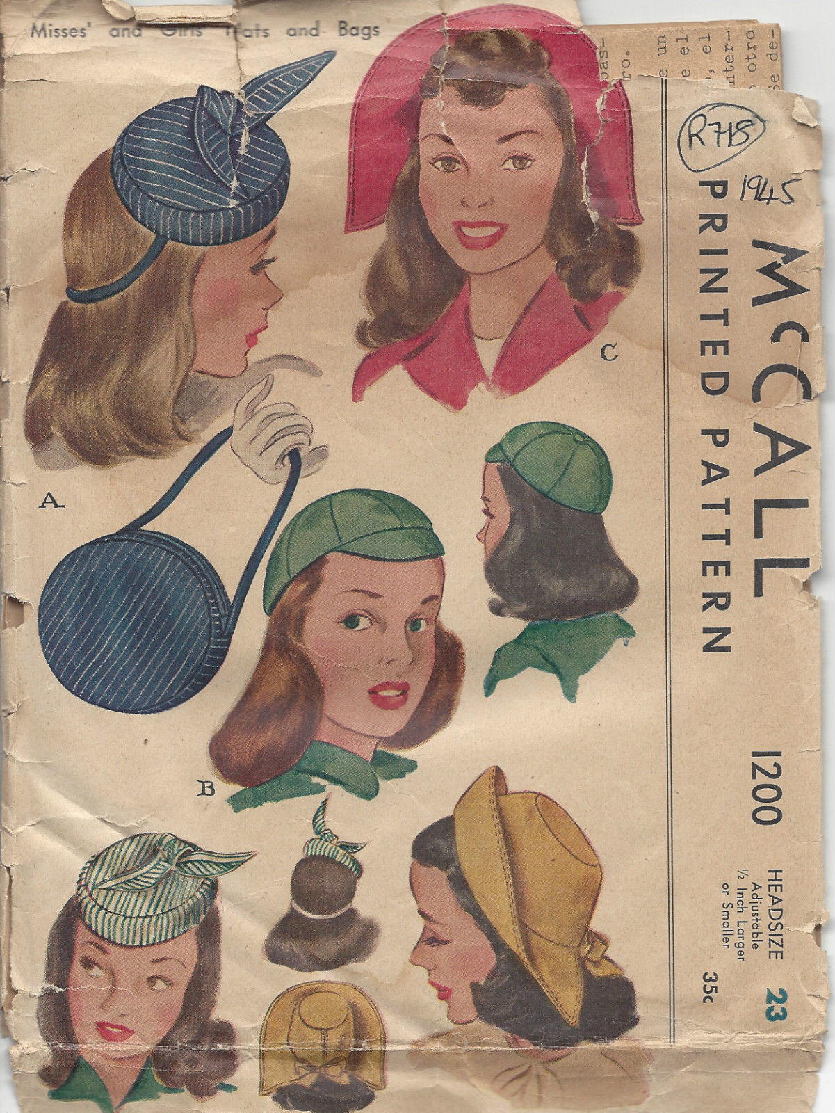 1945 Vintage Sewing Pattern S23″ HAT, CAP & BAG (R718)