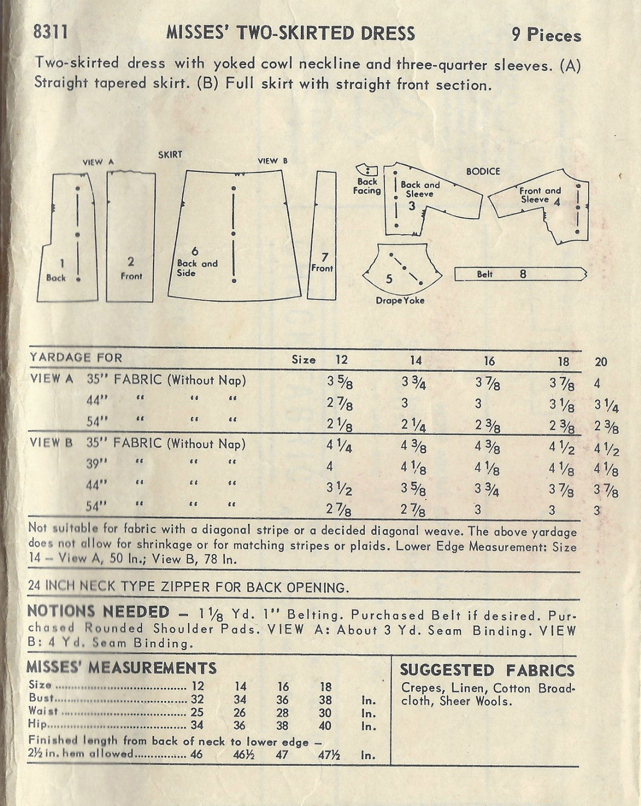 ~ Please Note: You are bidding on a ‘Professional Digitally Reproduced’ copy of this sewing pattern (copied from the original sewing pattern), produced in ‘Full Scale Pattern Pieces’ ready to cut with full instructions included. I have a vast collection of ‘Original Vintage Sewing Patterns’ ranging from the 1930s-to-1970s which are precious to me, so I decided to have copies professionally made to a very high standard by a reputable printing company. Therefore part of my collection of sewing patterns are reproduced to this quality high standard, on 50 gram paper with black ink. This will ensure a much longer lasting effect and easier to be used again and again. Also included with this product is: a plastic bound ‘Booklet’ giving instructions and Illustrations on ‘How to Adjust Your pattern to your Personal Measurement’, ‘Personal Measurement Chart’, ‘Body Form Illustrations’, ‘Note Pages’, ‘Garment History Page’ and ‘Fabric Worksheet’; all to facilitate with your pattern.