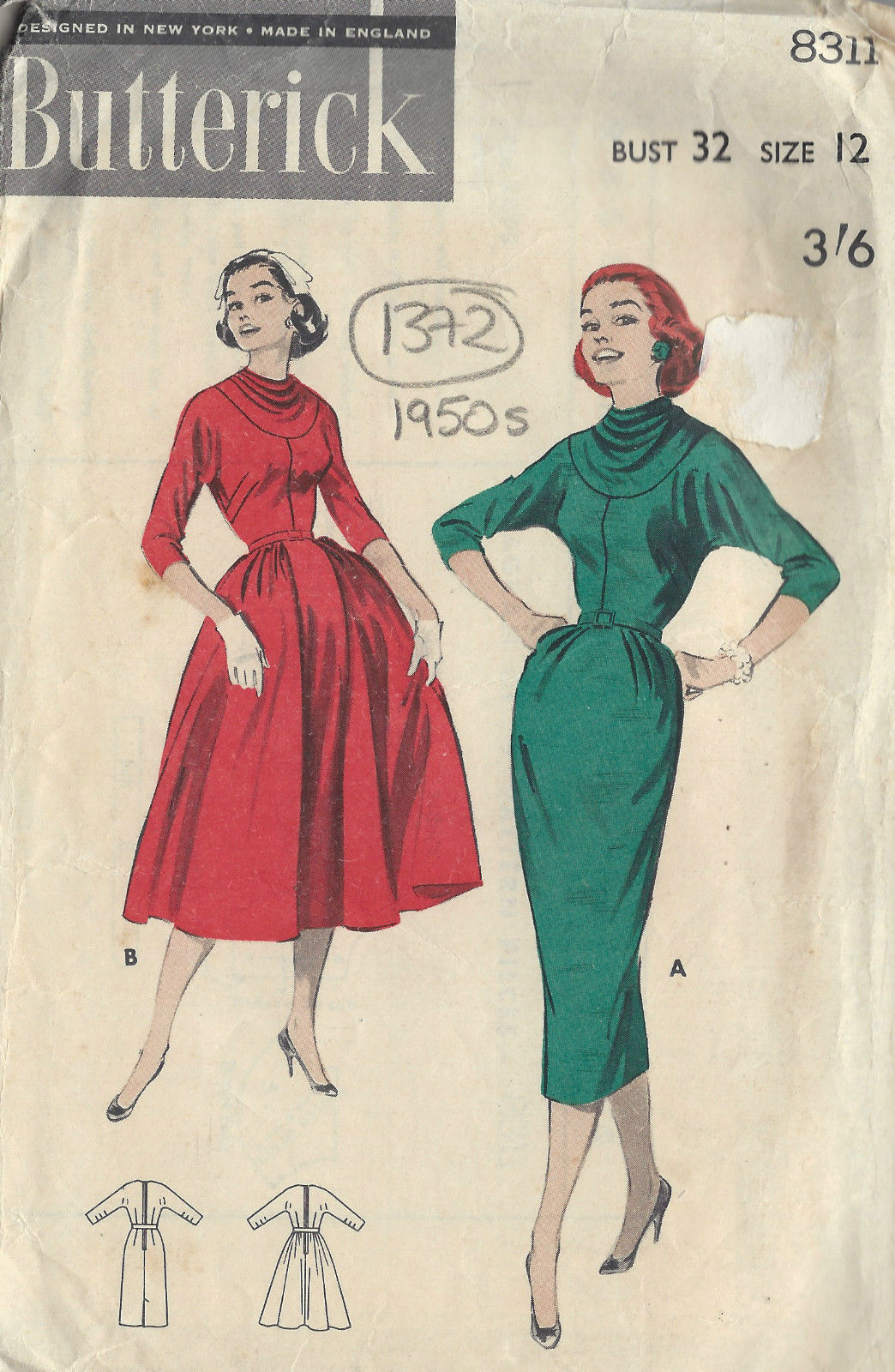 1950s Vintage Sewing Pattern B32 DRESS (1372)
