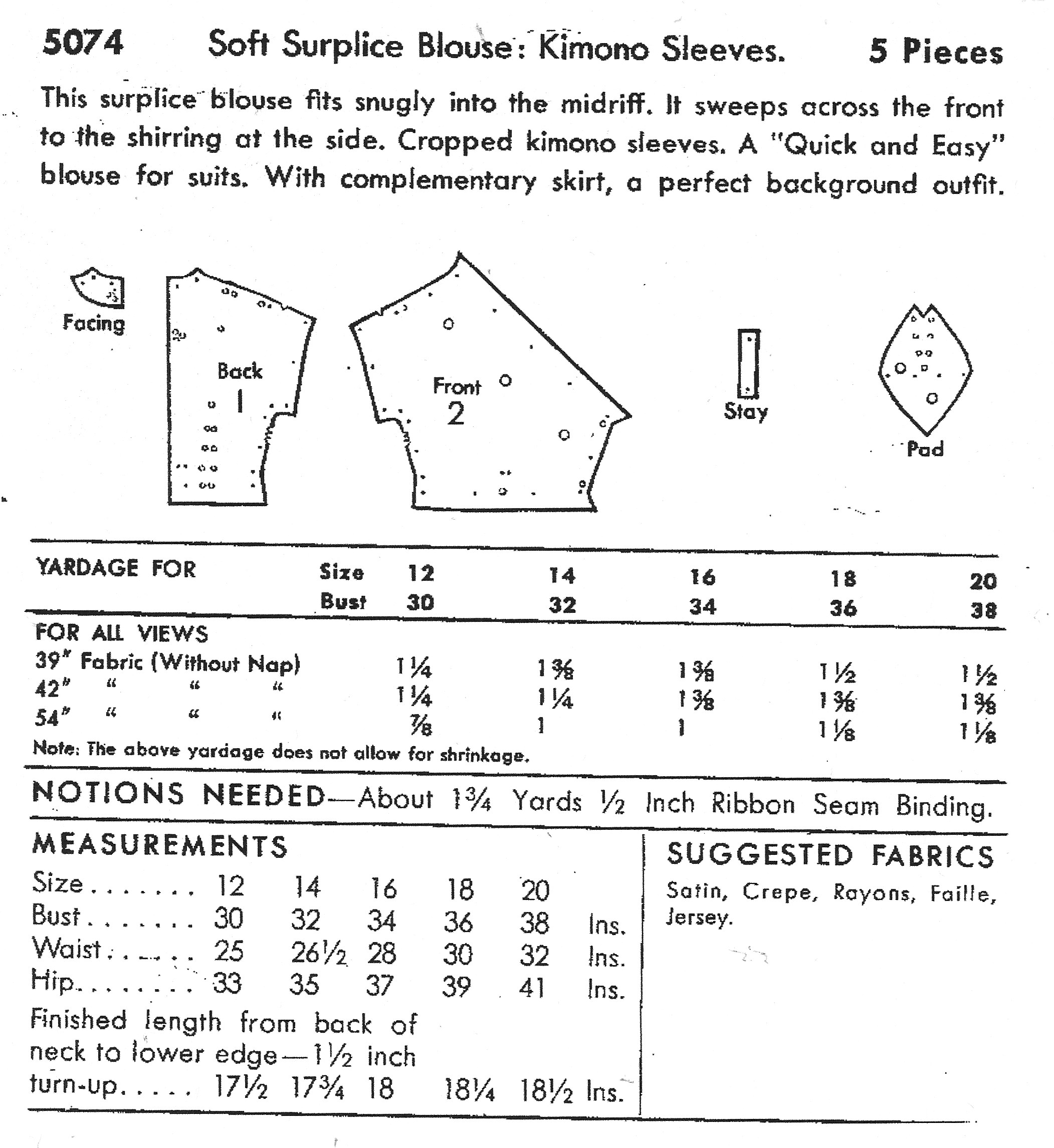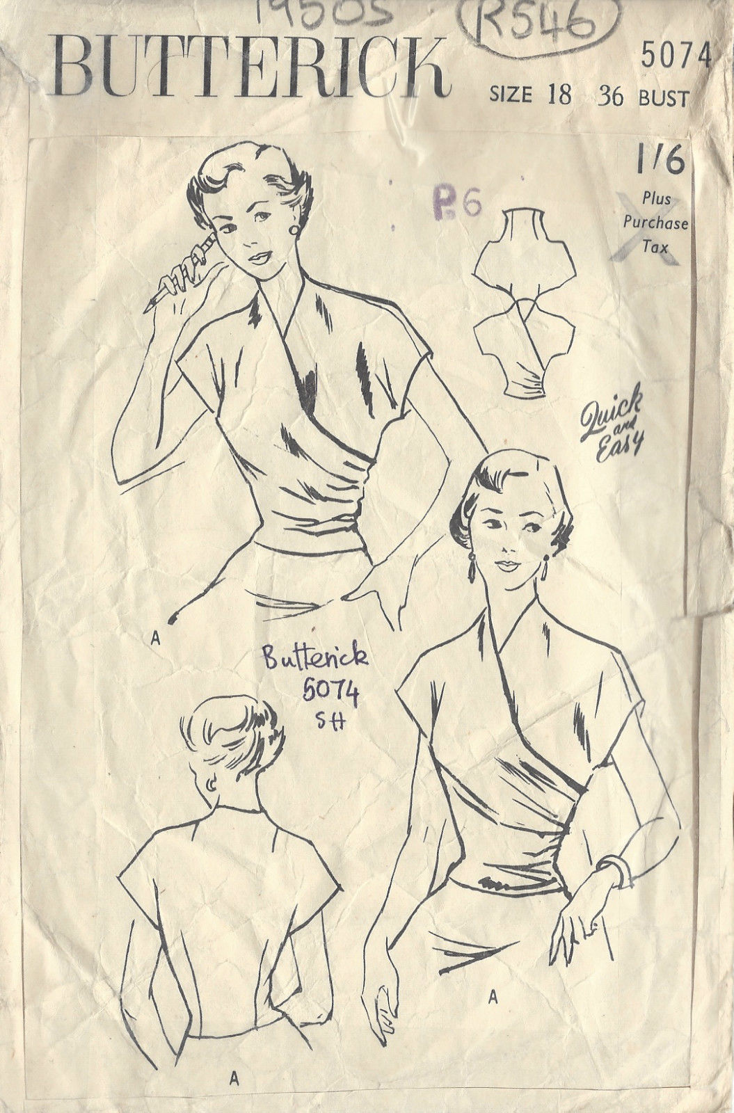 1950s Vintage Sewing Pattern BLOUSE B36″ (R546) By Butterick 5074