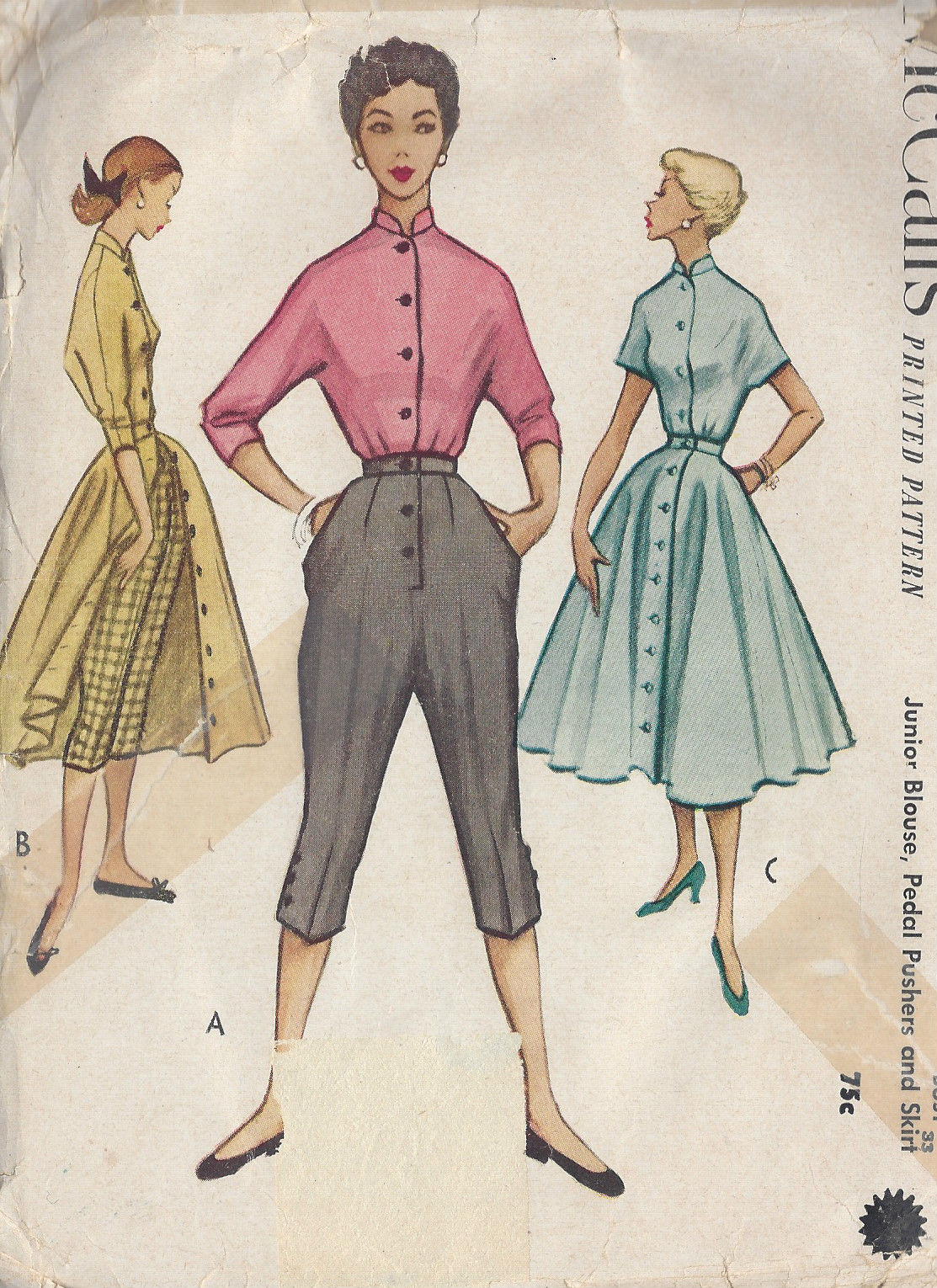 1952 Vintage Sewing Pattern B33″ -W27″ SKIRT, BLOUSE & PEDAL PUSHERS (R824) BY McCall’s 9081