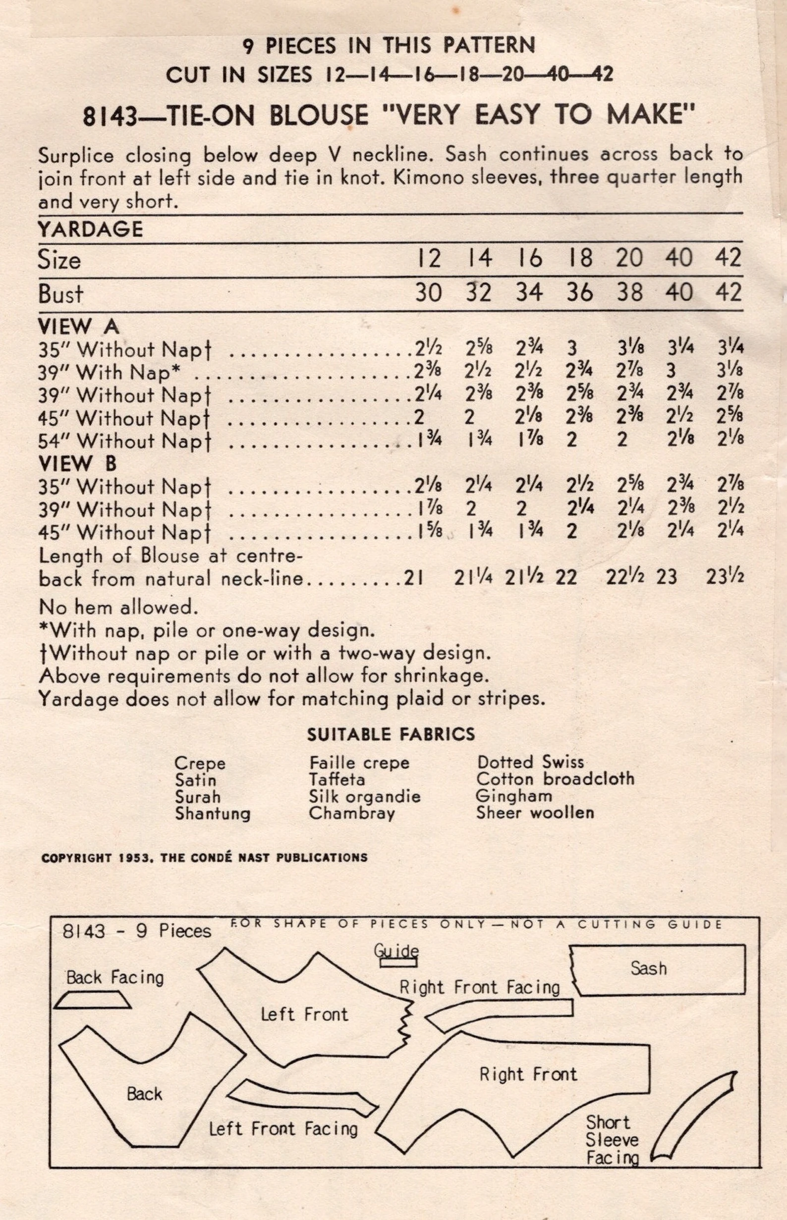 1953 Vintage VOGUE Sewing Pattern B40in Tie-On BLOUSE (2060) Vogue 8143