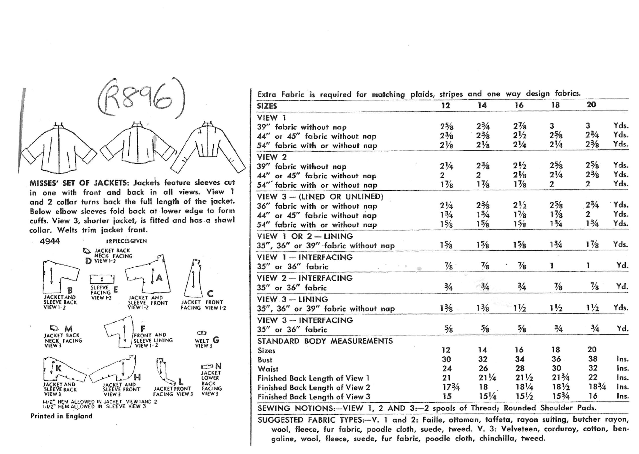 1954 Vintage Sewing Pattern B36″ JACKETS (R896) By Simplicity 4944