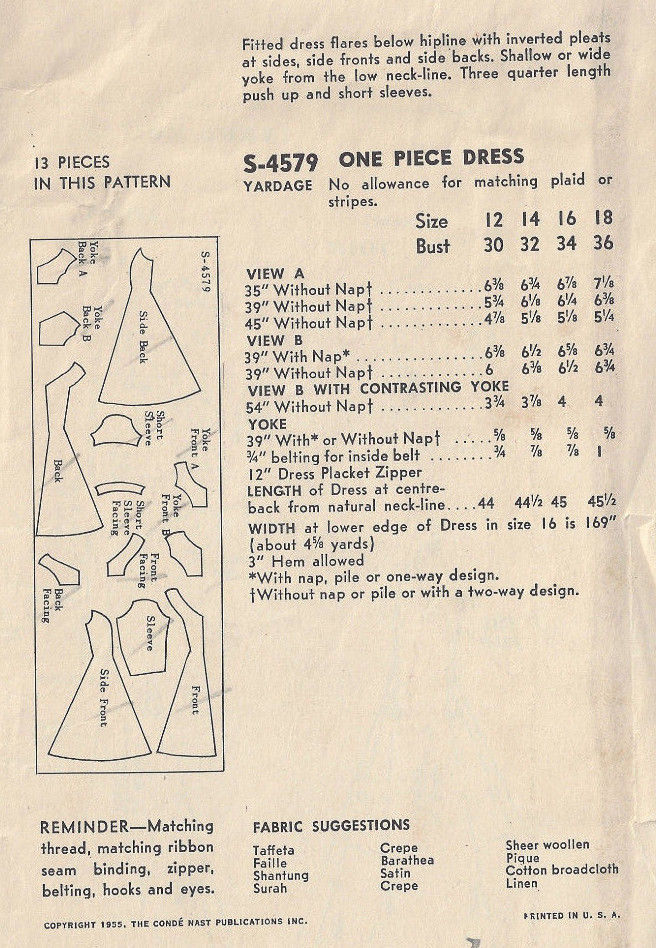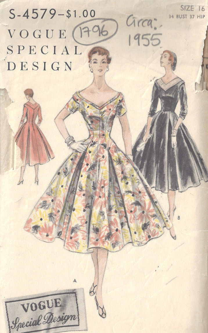 1955 Vintage Sewing Pattern B34in DRESS (1796) By VOGUE S-4579