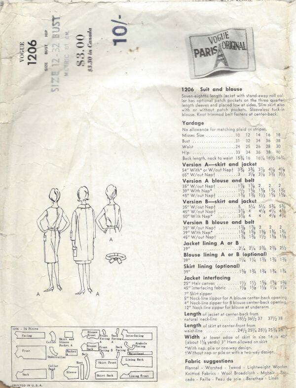 ~ Please Note: You are bidding on a ‘Professional Digitally Reproduced’ copy of this sewing pattern (copied from the original sewing pattern), produced in ‘Full Scale Pattern Pieces’ ready to cut with full instructions included. I have a vast collection of ‘Original Vintage Sewing Patterns’ ranging from the 1930s-to-1970s which are precious to me, so I decided to have copies professionally made to a very high standard by a reputable printing company. Therefore part of my collection of sewing patterns are reproduced to this quality high standard, on 50 gram paper with black ink. This will ensure a much longer lasting effect and easier to be used again and again. Also included with this product is: a plastic bound ‘Booklet’ giving instructions and Illustrations on ‘How to Adjust Your pattern to your Personal Measurement’, ‘Personal Measurement Chart’, ‘Body Form Illustrations’, ‘Note Pages’, ‘Garment History Page’ and ‘Fabric Worksheet’; all to facilitate with your pattern.