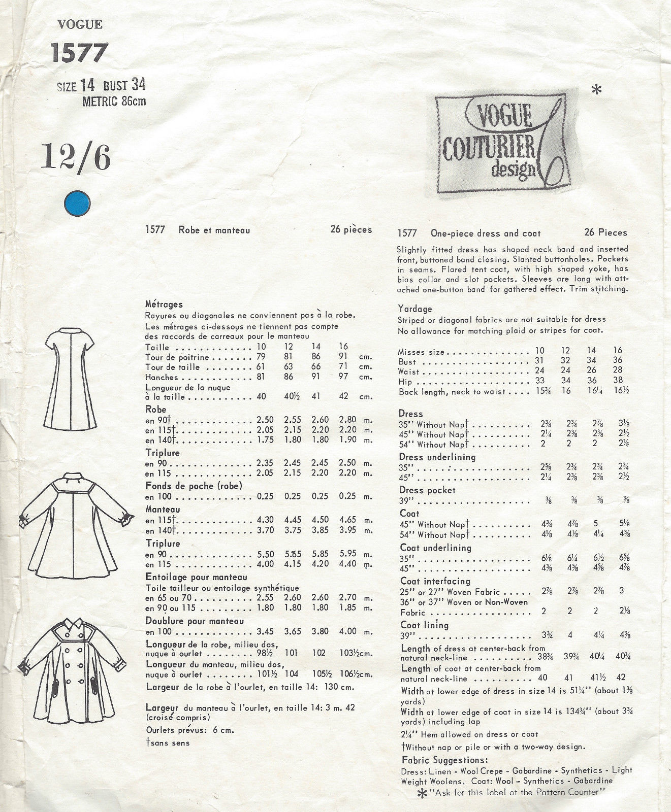 1965 Vintage VOGUE Sewing Pattern B34″ COAT & DRESS (1318) By Fabiani of Italy