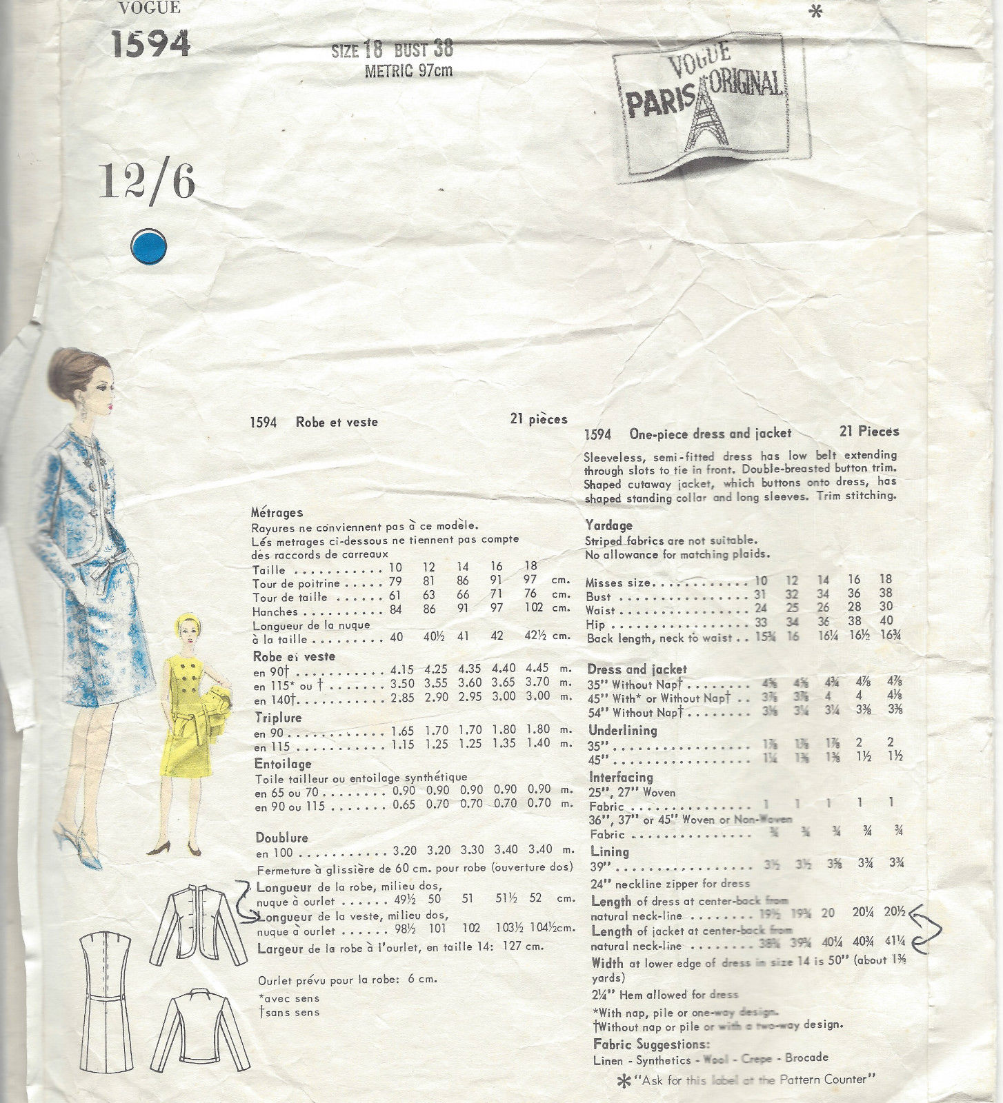 1966 Vintage VOGUE Sewing Pattern B38″ JACKET & DRESS (1515R) By LANVIN