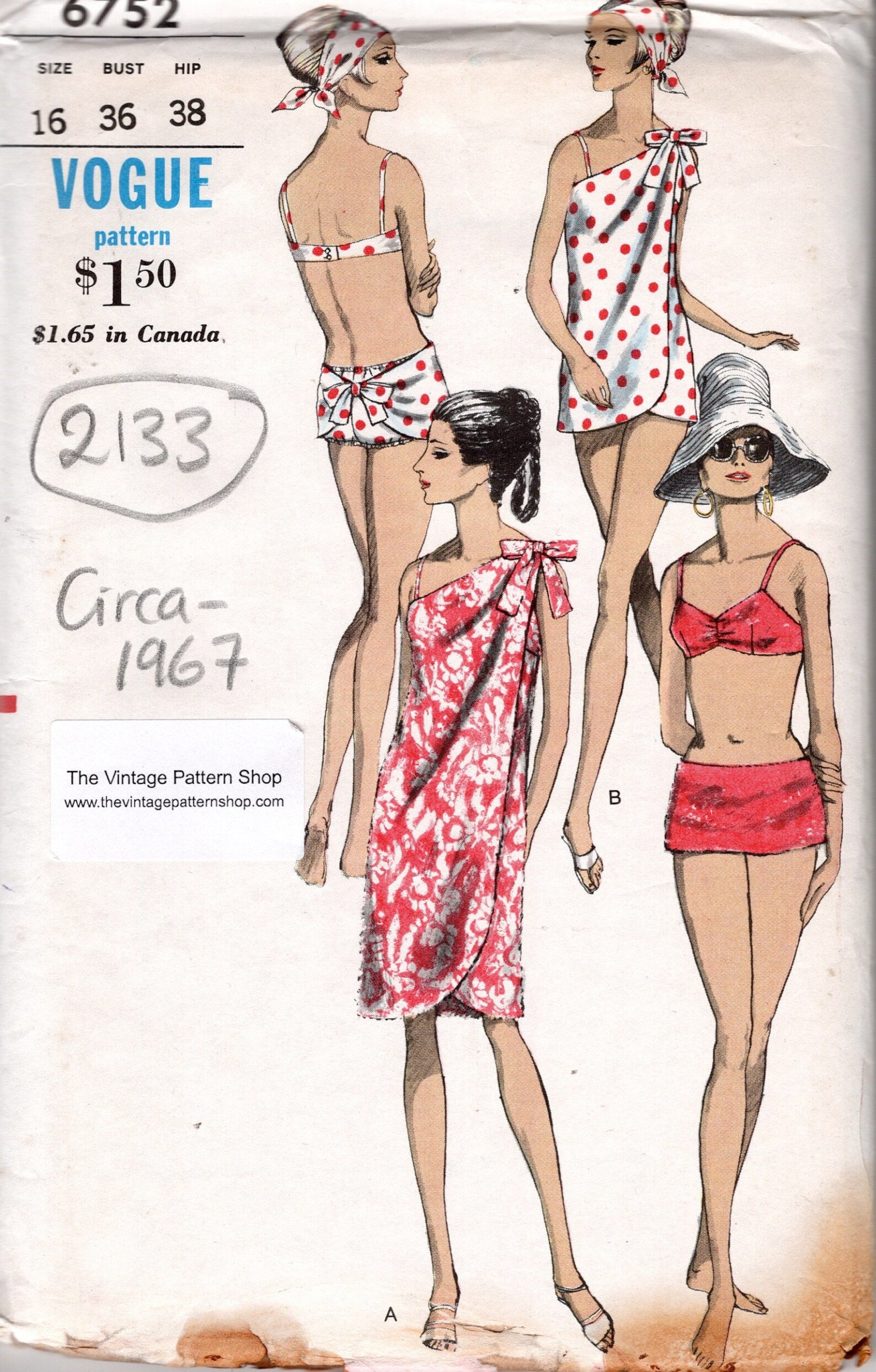 1967 Vintage VOGUE Sewing Pattern B36″ TWO-PIECE Bathing Suit & Coverup (2133) Vogue 6752