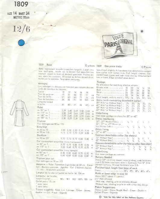 1967 Vintage VOGUE Sewing Pattern DRESS B34″ (1527) By Patou